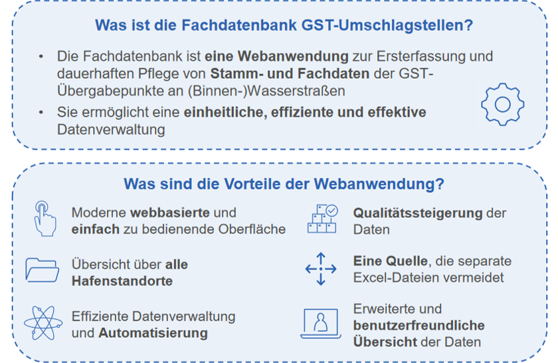 Um mehr Großraum- und Schwertransporte auf die Schiene und die Wasserstraßen zu verlagern, startet das Bundesministerium für Digitales und Verkehr den Aufbau einer digitalen Datengrundlage zur Integration von GST-Übergabepunkten an Bundeswasserstraßen. Die Stärkung des Gesamtsystems aus Häfen und Wasserstraßen soll durch eine bessere Vernetzung der Verkehrsträger in der multimodalen Transportkette erfolgen.