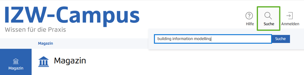 - Mit einem Klick auf das Magazin gelangen Sie zu einer Übersicht von allen Kategorien, zu denen IZW-Campus Inhalte bereitstellt. Um Ihnen die Navigation zu erleichtern, sind die Kategorien in ihrer Systematik an die Kategorien des IZW-Portals (z.B. Planen & Bauen, Betrieb & Unterhaltung, etc.) angelehnt. Außerdem finden Sie hier auch eine alphabetisch sortierte Liste, die Ihnen einen Überblick über alle Angebote auf IZW-Campus bereitstellt sowie eine Systematisierung der aller Inhalte nach Veranstaltungsformaten und Softwarepaketen.